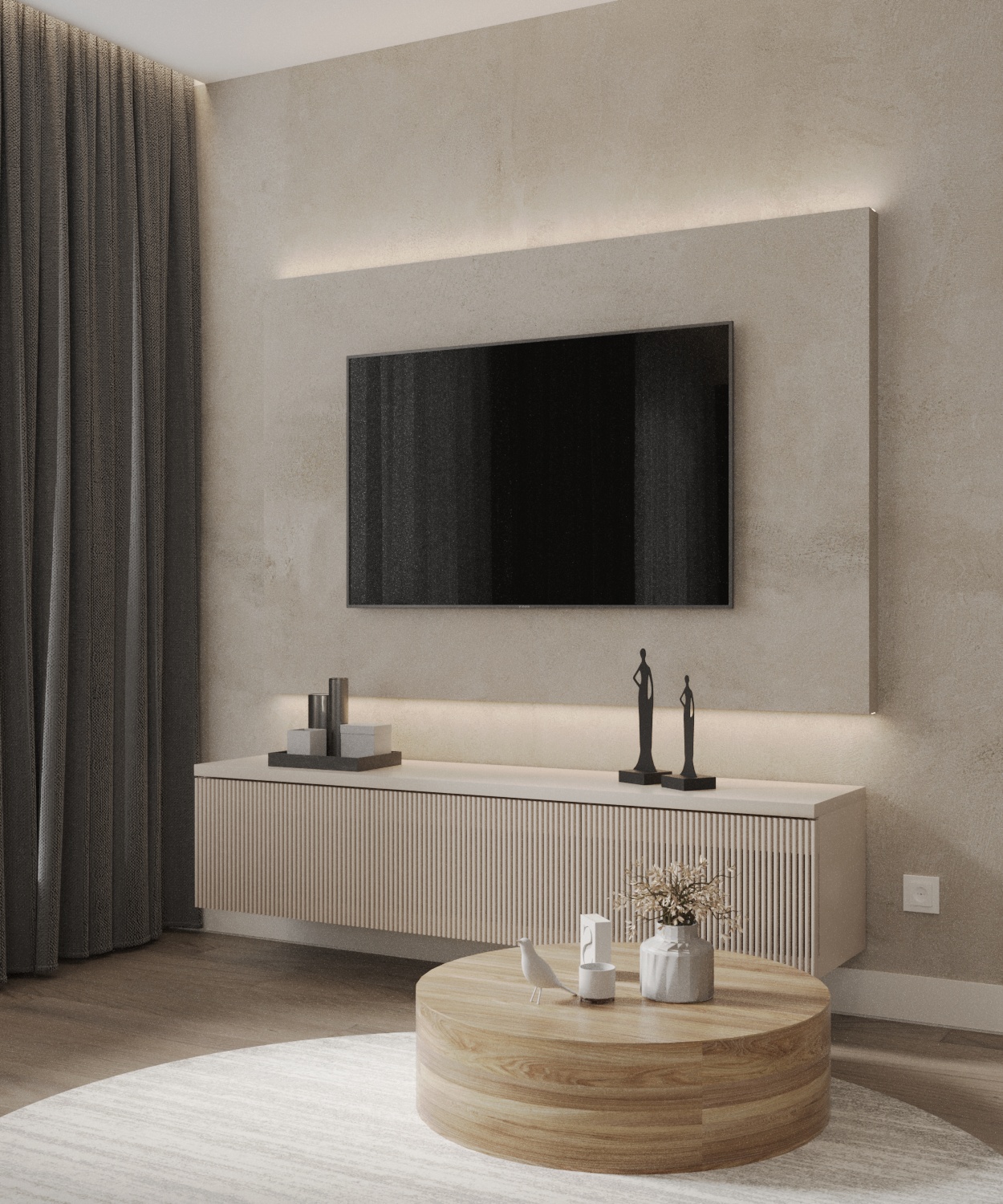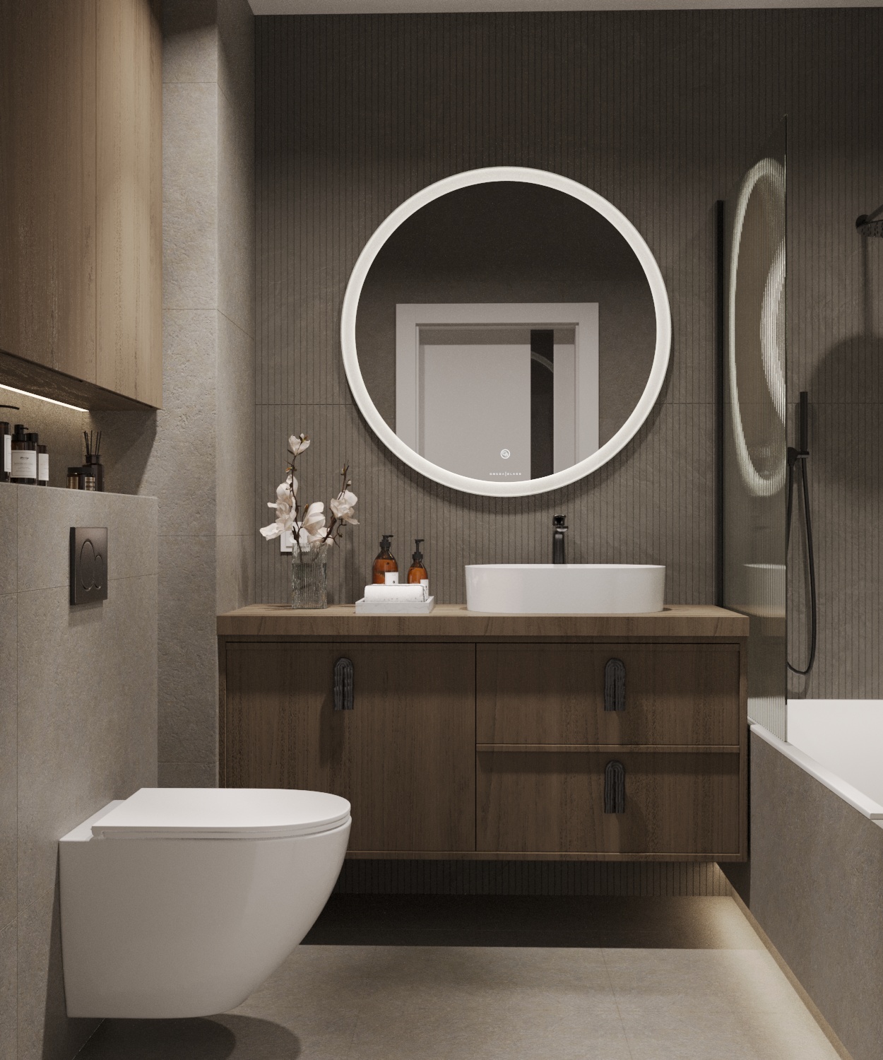 Łazienka nawiązuje do kolorystyki kuchni, dzięki czemu cały projekt jest spójny. Dominują tu odcienie ciepłego beżu i brązu, a także naturalne faktury. Szafkę pod umywalkę wykonano z forniru, co ociepla wnętrze. Podświetlenie mebla i lustra nadaje łazience nastrojowy klimat, a jednocześnie poprawia funkcjonalność. Okrągłe lustro jest centralnym punktem aranżacji, natomiast pionowe ryflowanie ściany za nim wprowadza subtelną grę światła i cienia.