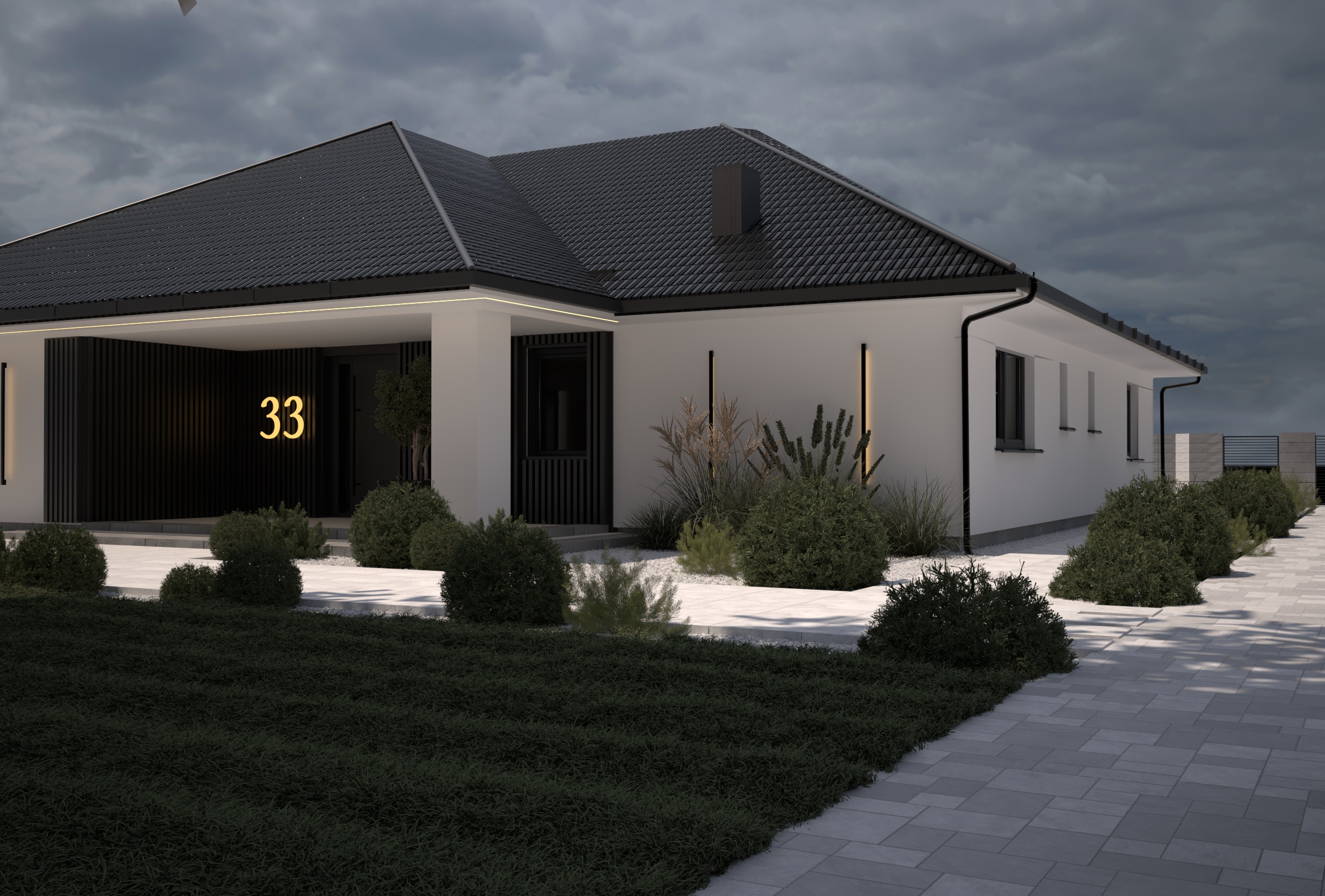 Minimalistyczna elewacja domu parterowego z czarnymi akcentami 🖤✨